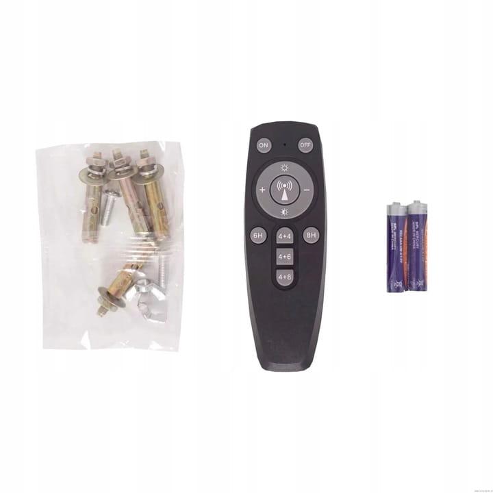 - Pilot zdalnego sterowania: regulacja jasności, timer 3h 5h 8h, funkcja ON OFF, czujnik zmierzchu (automatyczne zapalanie się lampy po zmierzchu i gaszenie za dnia)