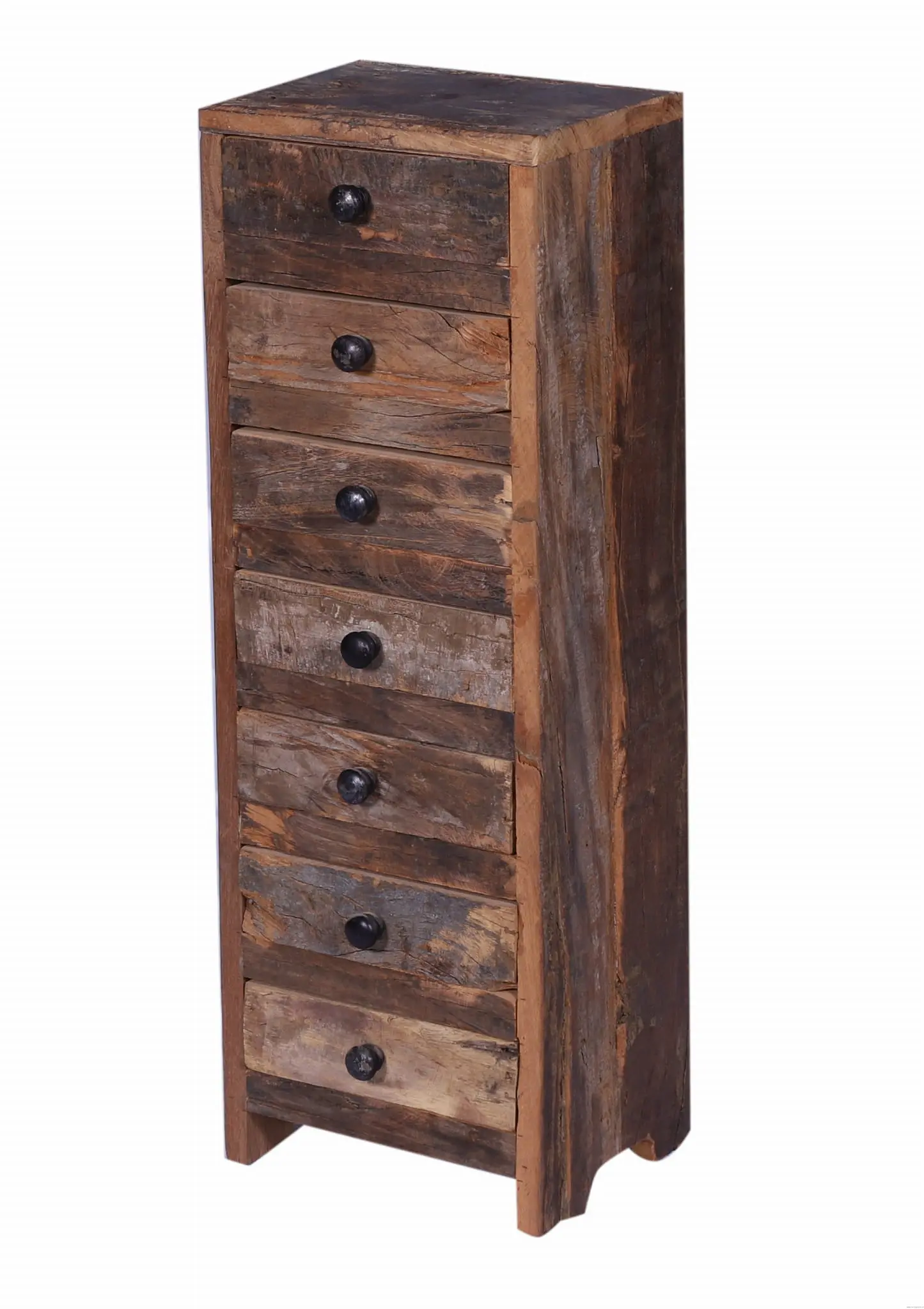 Mała komoda do przechowywanie drobnych przedmiotów .Komoda posiada 7 szuflad i jest wysokości 59 cm wykonana w drewna z recyklingu w stylu Retro