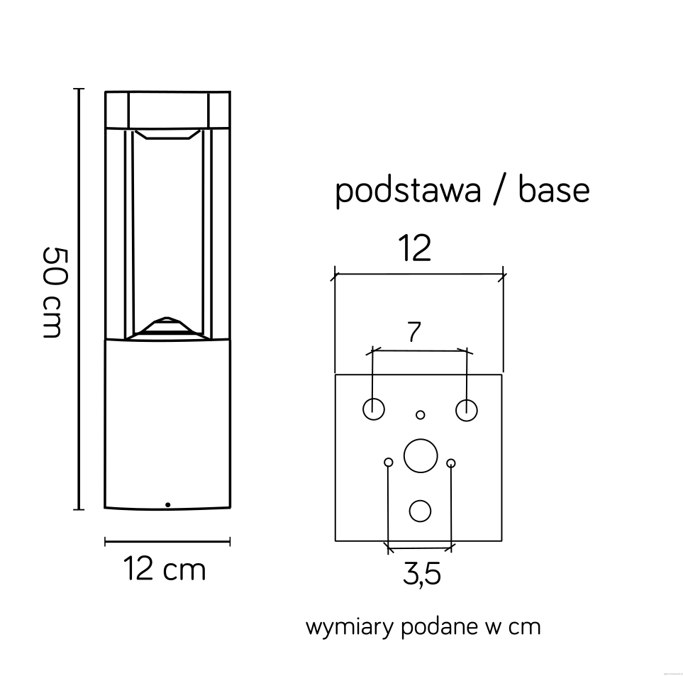 •wysokość 50 cm •średnica podstawy 12, X 12 cm |