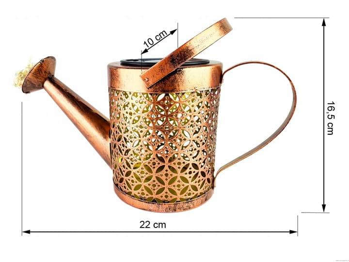To oświetlenie solarne stanowi piękną ozdobę Twojego ogrodu zarówno w dzień jak i w nocy. Dzięki zasilaniu solarnemu oraz dużej pojemności baterii .Ta lampa solarna będzie świecić przez większą część nocy a przyjemne i delikatne światło sprawi że twój ogród będzie wyglądał zachwycająco. Lampa imituje konewkę wraz ze strumieniem wody do podlewania roślin .Wykonana z metalu w kolorze miedzianym i tworzywa sztucznego Ta lampa Konewka doda uroku Twojemu ogrodowi lub tarasowi.