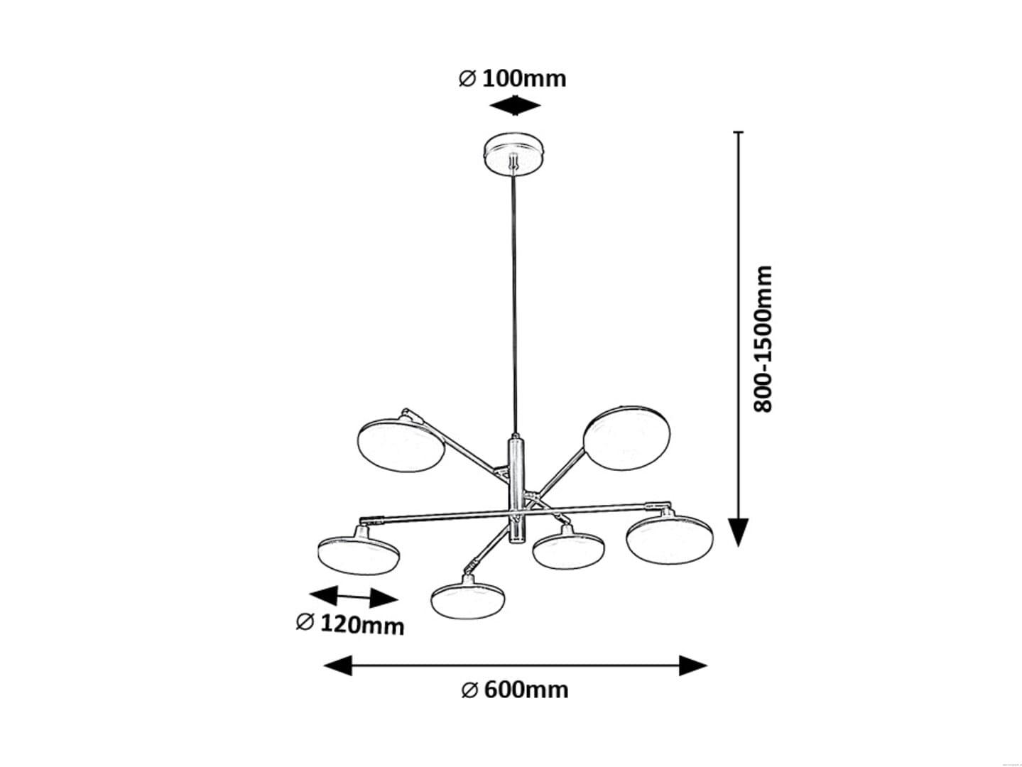 Wymiary oprawy wiszącej Madi z sześcioma punktami wiszącymi są następujące: średnica 600 mm, zwis regulowany w zakresie od 800 do 1500 mm, średnica poszczególnych kloszy 120 mm, średnica otworu montażowego 100 mm.