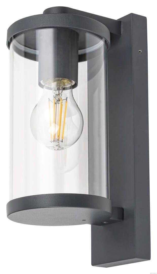 Aluminiową oprawę w kolorze antracytowym uzupełnia przezroczysty, cylindryczny szklany klosz, który pozwala zobaczyć źródło światła wewnątrz lampy.. Kinkiet posiada wejście na żarówkę z gwintem E-27.